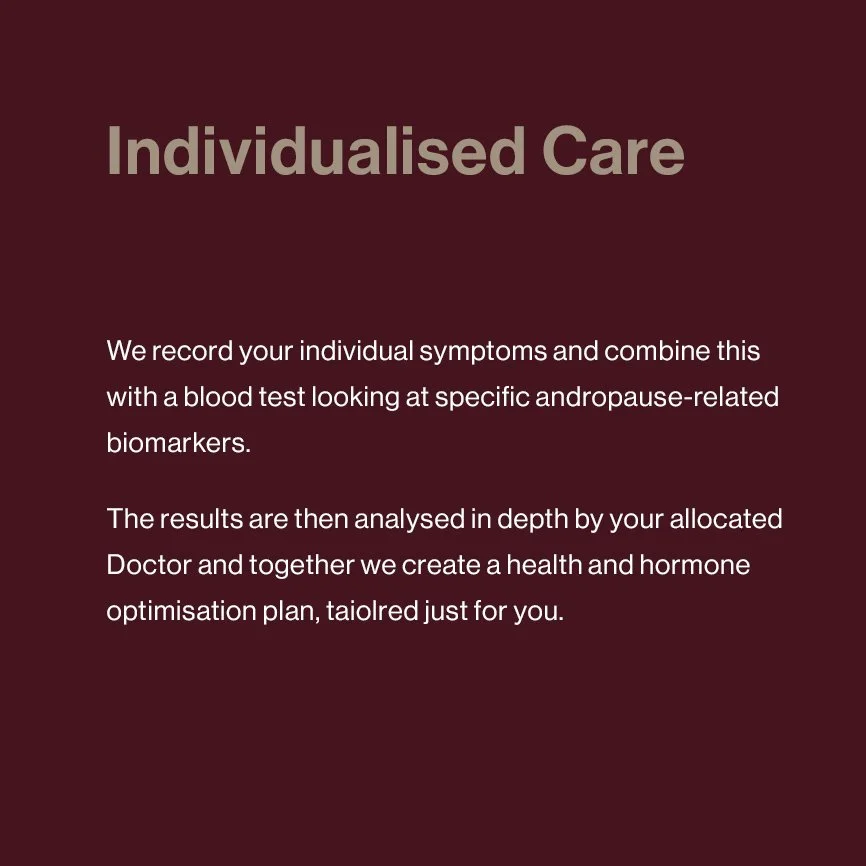 Through our personalised hormone optimisation therapy, we analyse each individual’s blood biomarkers to create a treatment plan that restores balance, vitality, and performance. Combining advanced medical expertise with innovative technology, we deliver care that is as dynamic and individual as the men we serve — helping you restore, rejuvenate, and thrive.